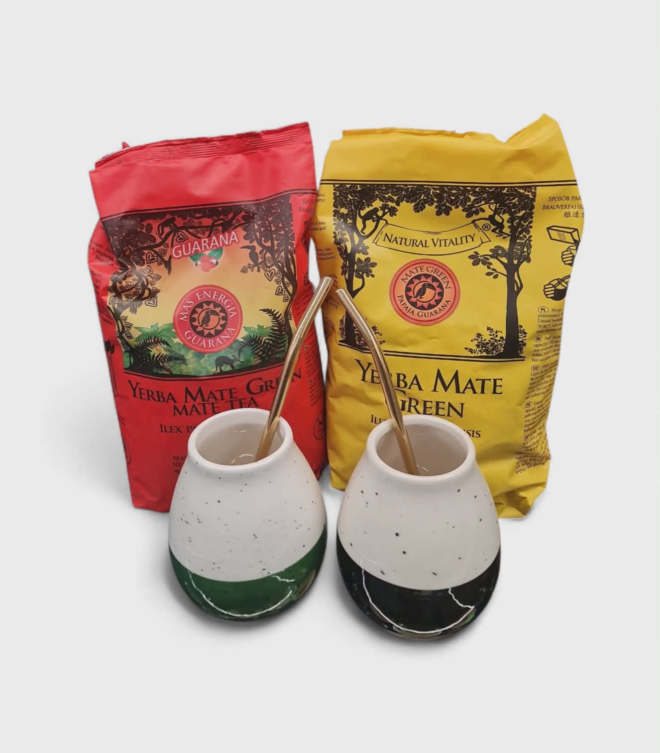 Komplektas dviems kurį sudaro dvi keraminės kalabasos, nerūdijančio plieno bombilos ir 2 vnt. 400 g žaliosios matės.